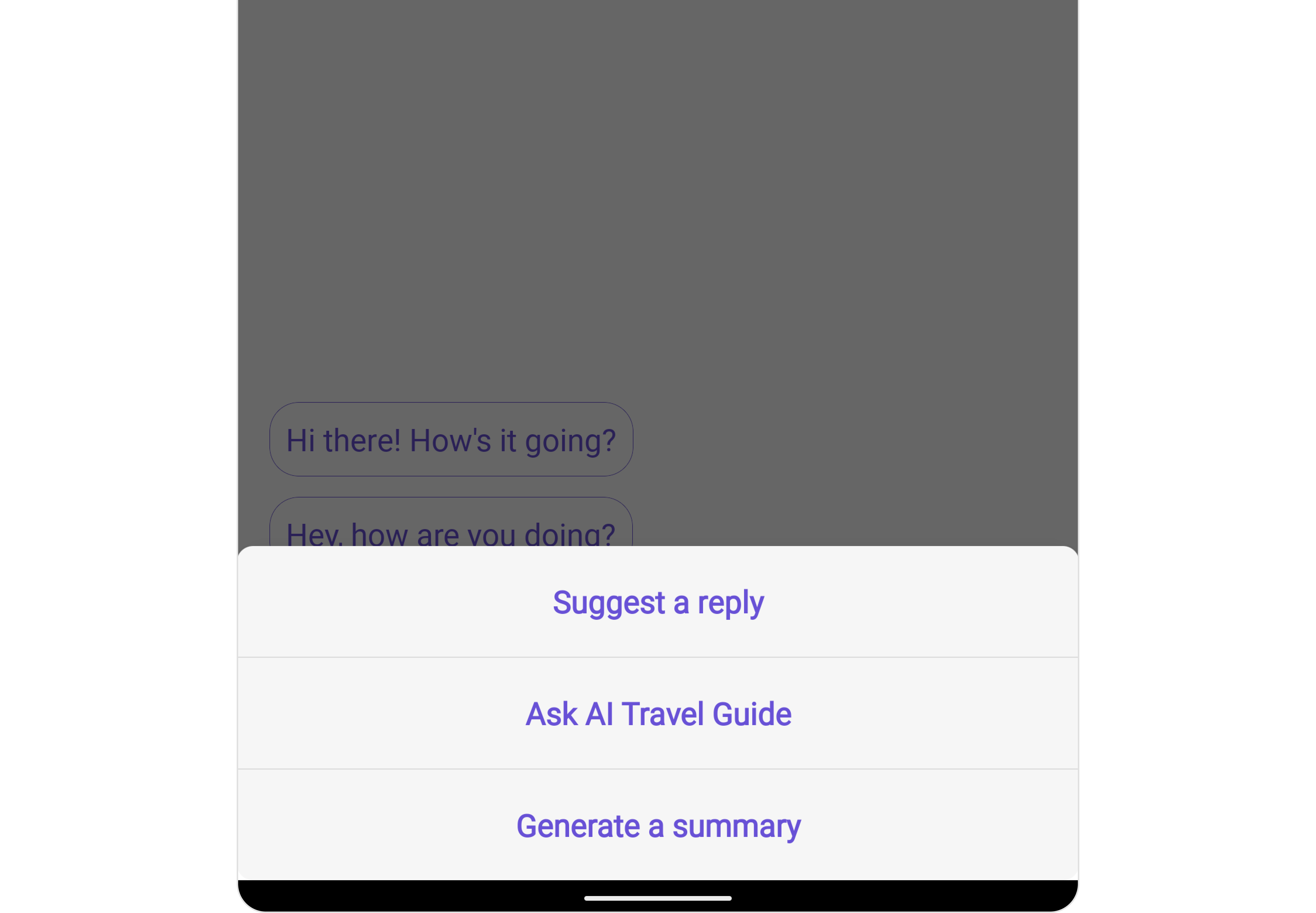 Smart Replies are AI-generated responses to messages. They can predict what a user might want to say next by analyzing the context of the conversation. This allows for quicker and more convenient responses, especially on mobile devices. For a comprehensive understanding and guide on implementing and using the Smart Replies, refer to our specific guide on the Smart Replies. Once you have successfully activated the Smart Replies from your CometChat Dashboard, the feature will automatically be incorporated into the Action sheet of MessageComposer Component of UI Kits.