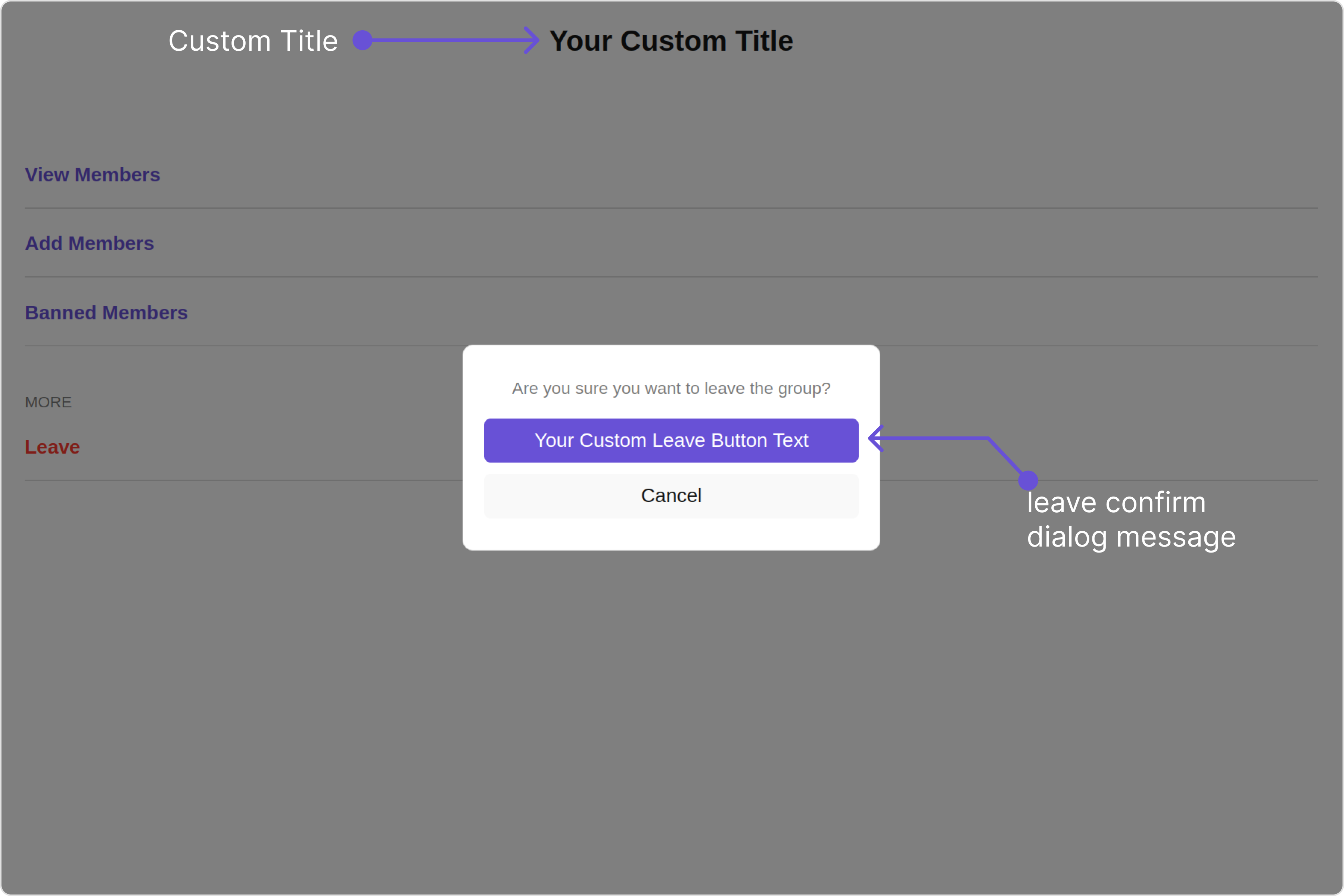 | leaveButtonText report | Used to set custom leave button text | leaveButtonText='Your Custom Leave Button Text' |
